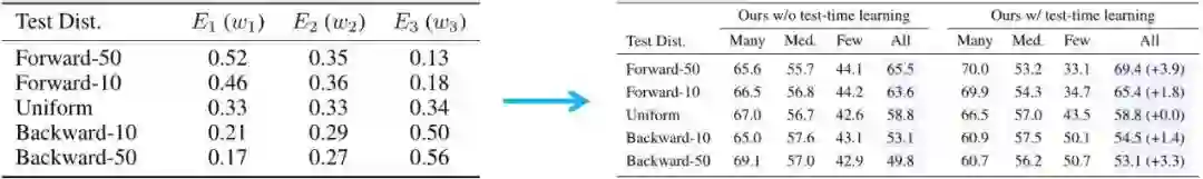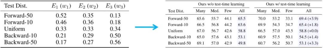 该策略能有效学到适用于未知测试类别分布的专家组合权重(如下表左),从而在不同类别分布(除均匀分布外)的测试集上都能获得显著的性能提升(如下表右)。