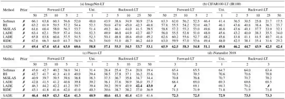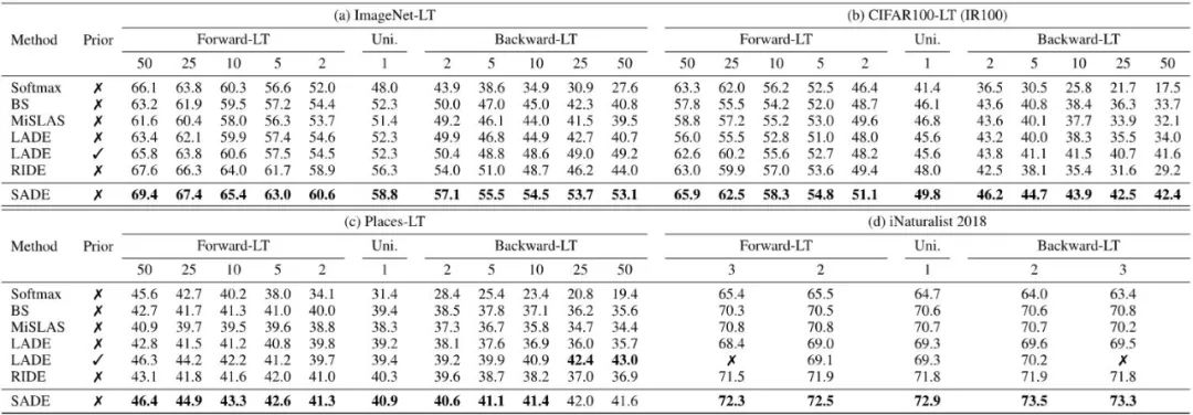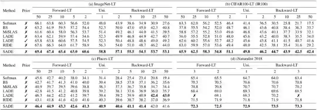 基于上述策略,SADE 能够在多个数据集的各种类别分布测试集(包括均匀分布、长尾分布、反向长尾分布)上取得最优的性能。