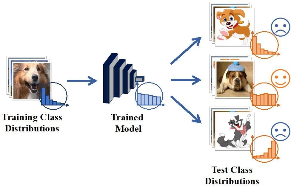 如下示意图所示,由现存长尾方法训练得到的模型虽能够较在服从均匀分布的测试集上表现良好,但却无法处理好遵循其他类别分布的测试集。这就导致那些在论文中看似表现良好的长尾学习模型无法较好地应用到实际场景中。