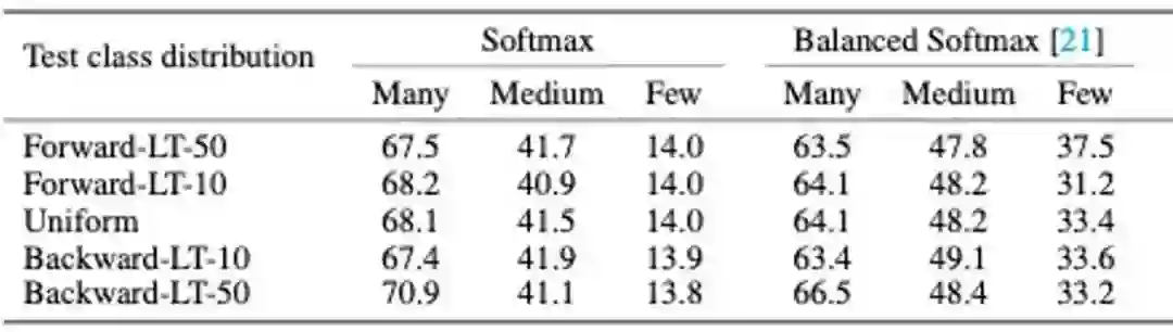 动机和方法框架 该工作发现:不同方法所得模型的性能分布是相对固定的,并不会随着测试分布的变化而变化。如下表所示,传统的 Softmax Cross-entropy 拟合原始长尾分布,因此它在多数类(Many-shot classes)上表现得比少数类(Few-shot classes)更好。这一特性在不同类别分布的测试集上表现一致。而由长尾学习方法(如 Balanced Softmax)所得到的模型则表现得更为均衡,且其性能分布在各测试分布上表现一致。