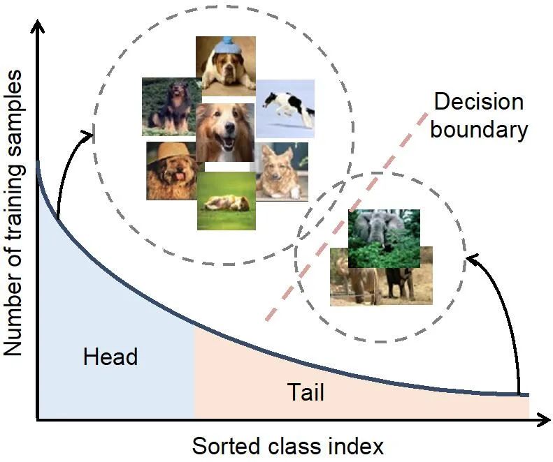 但在实际应用中,数据的不同类别往往遵循长尾分布(如下图所示):一小部分类别拥有大量的样本(被称为多数类),而其余大部分类别只有较少的样本量(被称为少数类)。