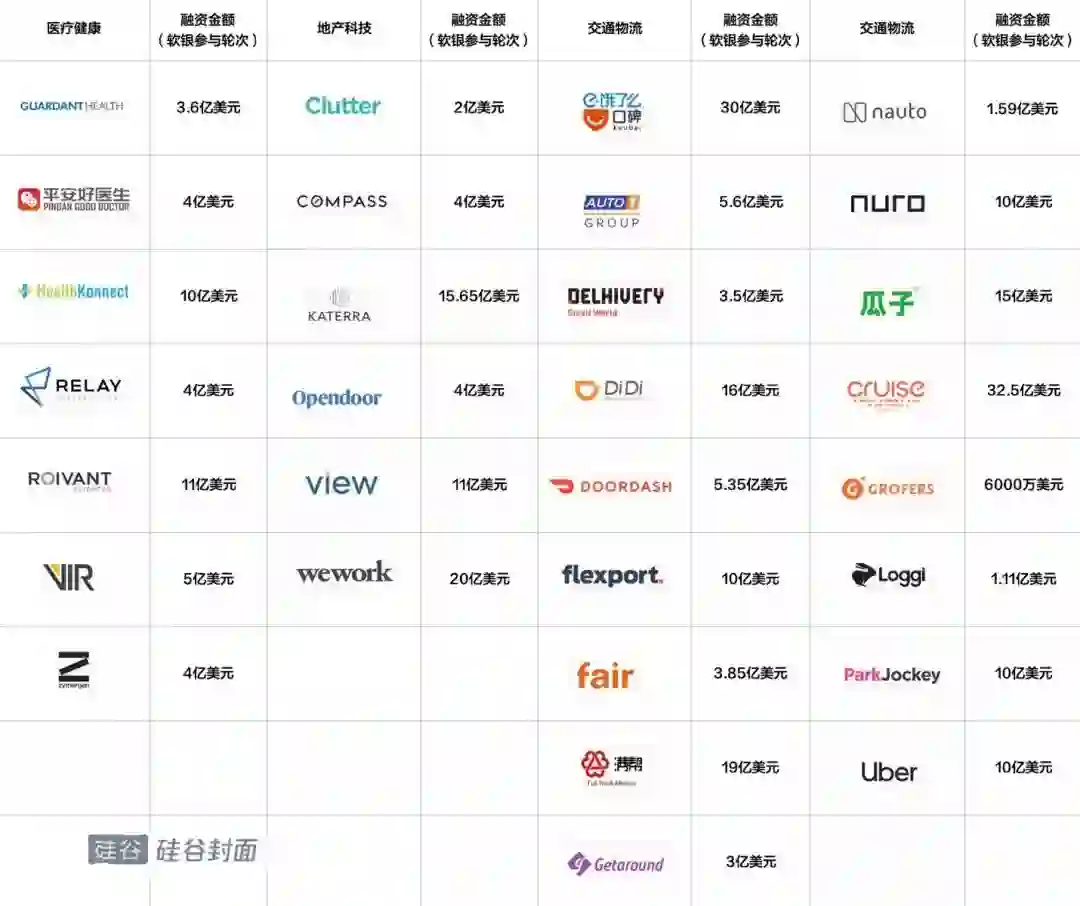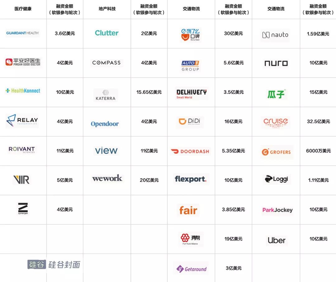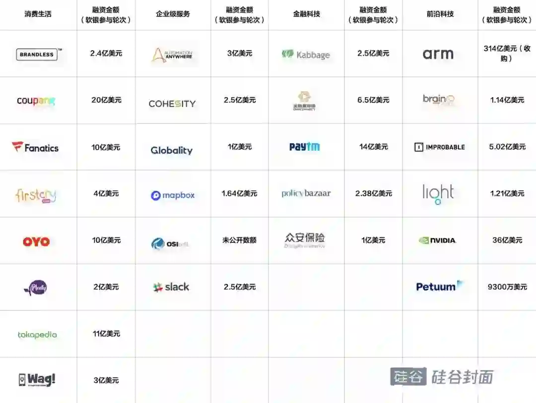 其中,出行领域包括Uber、滴滴、美国饿了么的Doordash、以及东南亚的GrabTaxi;人工智能包括字节跳动、商汤科技;自动驾驶包括英伟达(已清空)、通用Cruise、加州自动驾驶Nauto;生物科技;机器人领域包括波士顿动力;电商领域包括印度版阿里巴巴Flipkart;还有包括联合办公巨头WeWork、印度经济型酒店OYO等等。