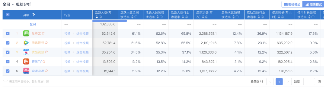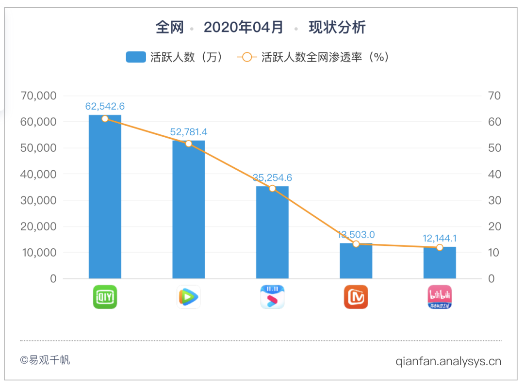 千帆 2020 年 4 月数据显示,爱奇艺的各项指标都位居第一,腾讯视频与优酷各居第二和第三。爱奇艺的活跃用户(在所选时间段内,用户主观打开过至少一次 APP,即算活跃用户)数达 6 亿以上,腾讯视频达 5 亿以上,优酷是 3 亿,芒果 TV 则是 1 亿。