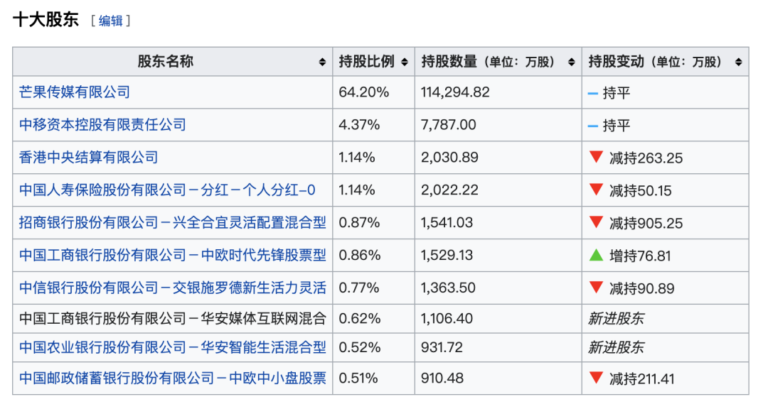 湖南广播电视台为该公司实际控制人。截至目前,湖南广电仍通过 100% 控股芒果传媒有限公司,持有芒果超媒 64.2% 股份。