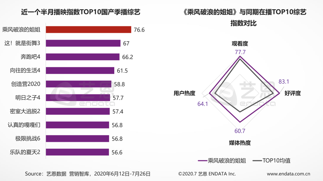 2020 年,芒果 TV 推出的真人秀节目《乘风破浪的姐姐》播映指数排名第一,整体热度相对靠前,好评度、观看度等四大指数均高于同期热播综艺 TOP10 均值,尤其媒体热度优势明显。该节目播出后,芒果超媒股价明显提升,相比年初,该公司的股价已上涨 82.5%,目前股价 70.2 元。