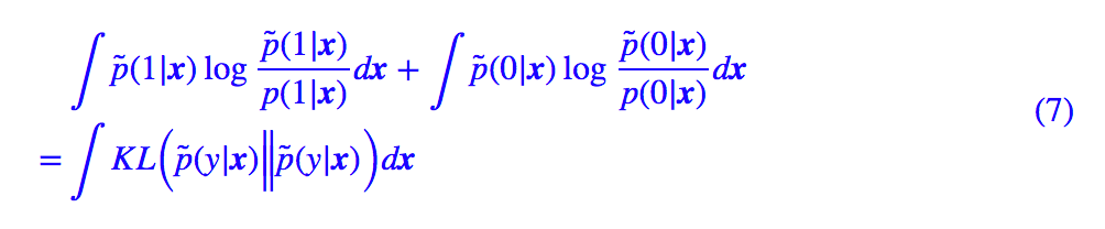 (7) 式是 KL 散度的积分,而 KL 散度非负,那么当“假设的分布形式是满足的、并且充分优化”时,(7) 式应该为 0,从而我们有 p̃(y|x)=p(y|x),也就是: