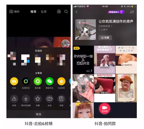 为了遏制这种现象,抖音推出了拍同款、同屏互动等功能。在技法成熟的作者发布一些有趣的、火爆的内容后,小白们可在该内容底下直接照葫芦画瓢,模仿原作者的动作表情、沿用特效与BGM,生成自己的视频内容。