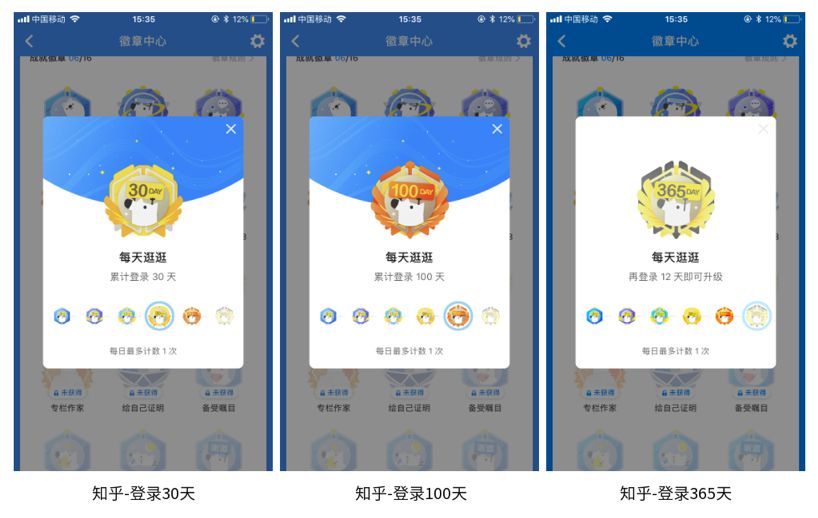 以知乎的勋章来说,「每天逛逛」勋章的核心目的是希望用户每日登陆,提高用户留存。但是,一开始就让用户背负365天登录这样的宏大目标,简直是太南了!