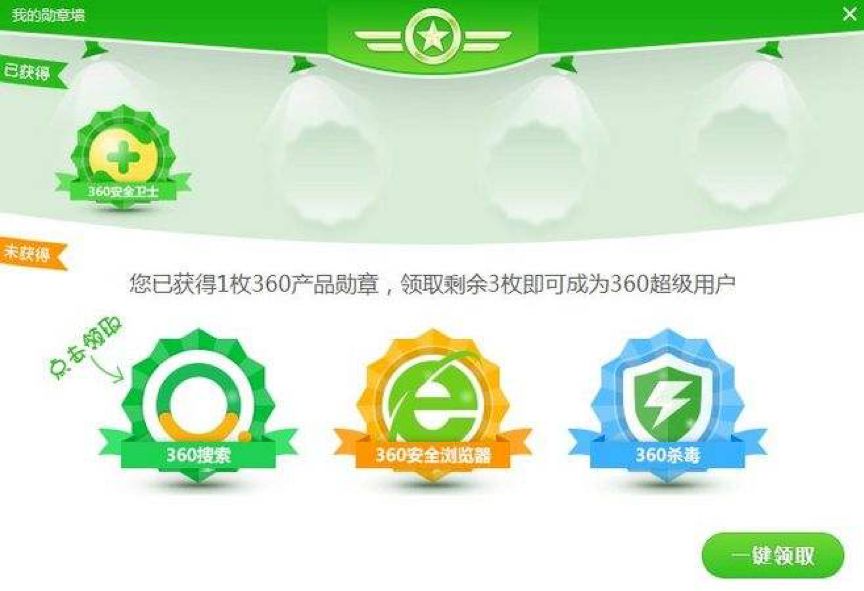 此时,系统果不其然地夸奖了你——“电脑现在超级安全,已经达到领取安全勋章的资格”。你点击领取之后,最后一个软件——360搜索也成功着陆到你的C盘里。