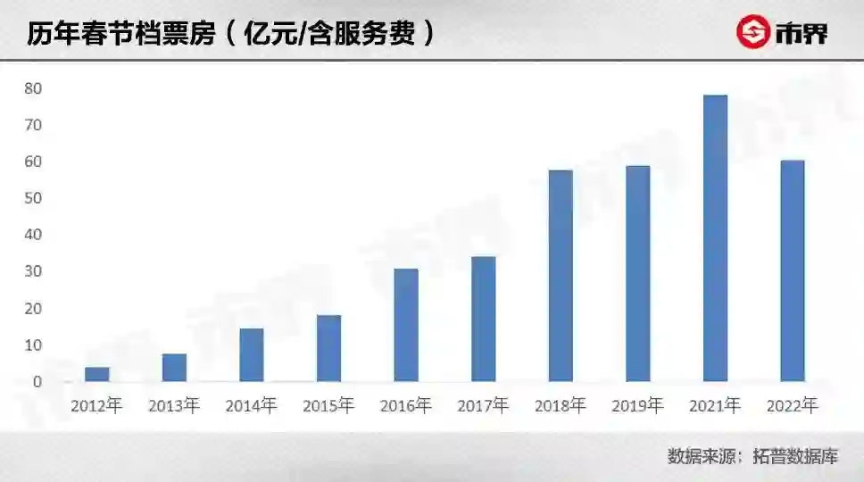 根据猫眼专业版和拓普数据库数据,春节档票房从2012年的4.16亿元增长到了2021年的78.42亿元,然后降到了2022年的60.37亿元,同比下降了23.02%。