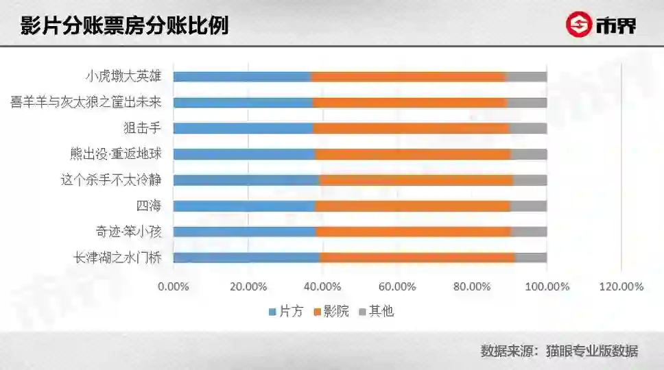 发行方一般能分到5%-8%,既包括华谊、万达、博纳等传统发行方,也包括阿里影业、猫眼电影等互联网发行方。