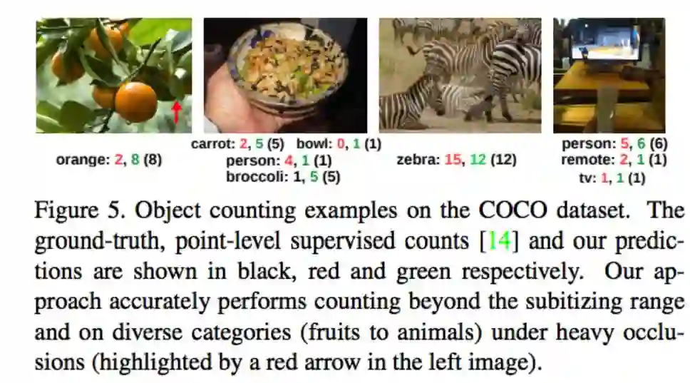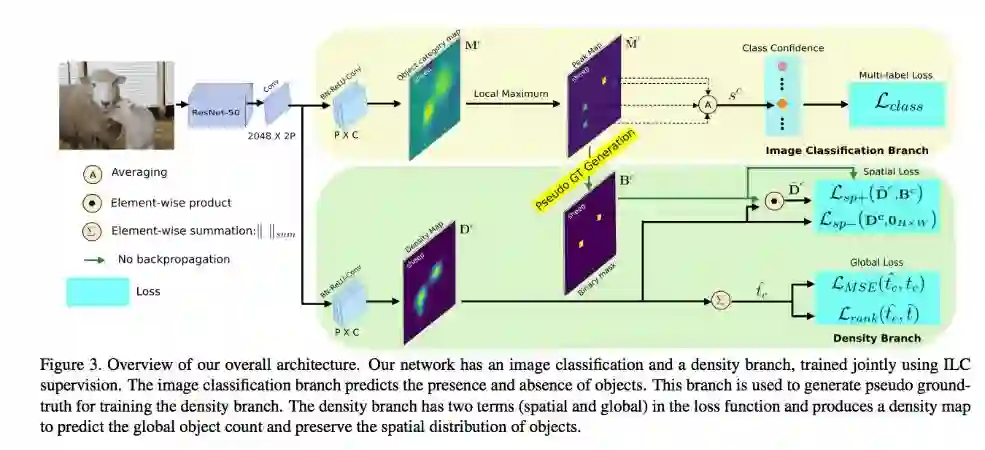 本文提出用于自然场景的计数模型,以往常见的计数模型是人群数测量,但自然场景测量与人群数测量的困难点不一样,人群数测量的问题中,人的数量通常很多,并且会有人与人之间的遮挡问题,但自然场景的计数模型的困难点为要学习不同种类 intra-class,除此之外一张图片还会出现不同种类多个物体的情况。而本文提出基于 Image-level 的方式训练,相较于以往需要(Instance-level / point-level / bounding box level)等等的训练方式来说,此模型只要有出现的类别以及各自的数量即可进行训练!还能够输出 Density map (可看作热力图),藉由 Density map 能得知其物体是出现在图片的哪个位置。并且使用几篇心理学为依据(这部分没去探究),大概就是说当人类看到一张照片有 1 ~ 4 个物件时,可以即时算出数量,不需要一个一个数。基于这个想法提出了一个物件数量限缩的训练方式,称作 ILC - Image-level lower-count (ILC) supervision。