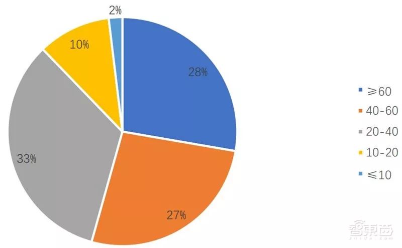 全球人脸识别学者的 h-index 平均数为 48, h-index 指数在 20 到 40 之间的学者最多,占比 33%; h-index 指数在 40 到 60 之间的学者和大于 60 占比相持不下,前者为 27%,后者为 28%; h-index 指数小于等于 10 的学者最少,仅占 2%。
