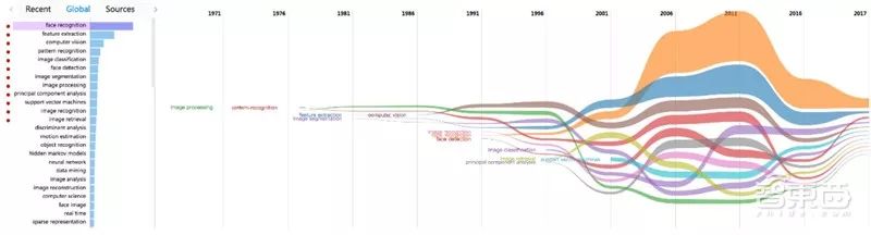 下图是对人脸识别研究趋势的分析,旨在基于历史的科研成果数据的基础上,对技术来源、热度甚至发展趋势进行研究。图 2 中,每个彩色分支代表一个关键词领域,其宽度表示该关键词的研究热度,各关键词在每一年份的位置是按照这一时间上所有关键词的热度高度进行排序。起初,Computer Vision(计算机视觉)是研究的热点,在 20 世纪末期,Feature Extraction(特征提取)超越 CV,成为研究的新热点,其后在 21 世纪初期被 Face Recognition 超过,至今一直处在第二的位置上。