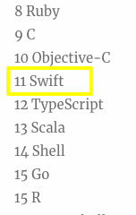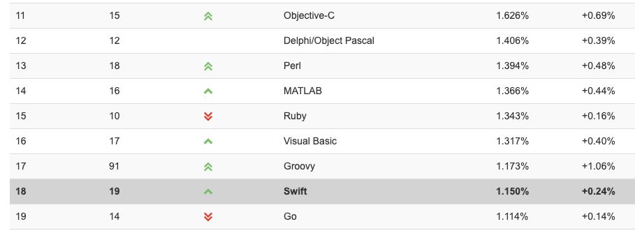 Swift是苹果最新的开发语言,有人呼吁谷歌取代TensorFlow的Python。目前在TOIBE排名18位: