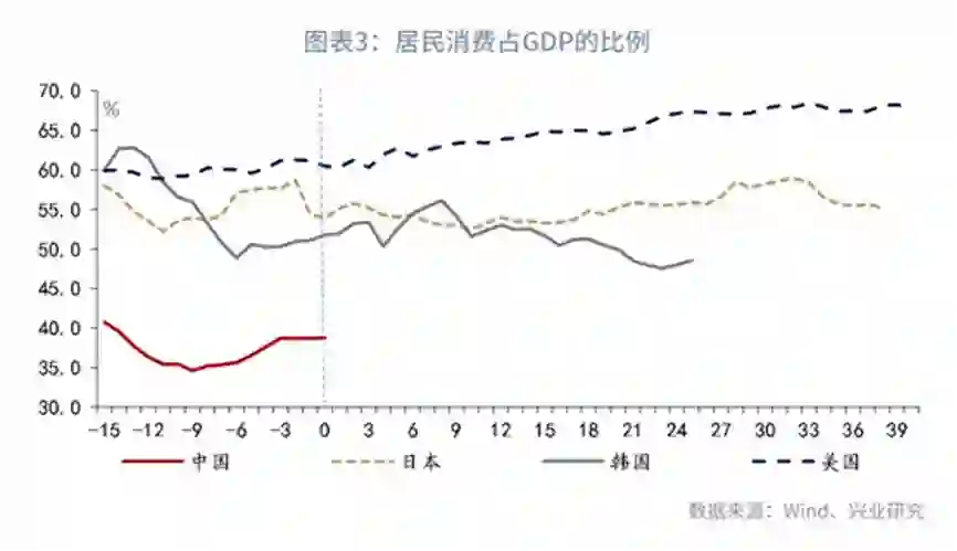 以人均GDP1万美元为节点,美国居民消费GDP占比60.5%,日本和韩国达到53.9%和51.8%,而中国居民消费占GDP比例为38.8%,提升空间巨大。