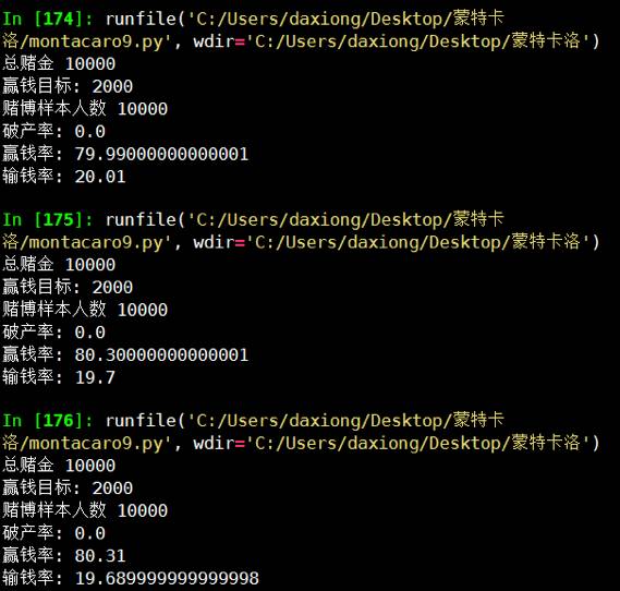 总结,今天我用蒙特卡洛模拟了历史上常见几种赌博模型,由于专业性较强,赌博模型只是简单介绍,以后有机会可详细阐述。
