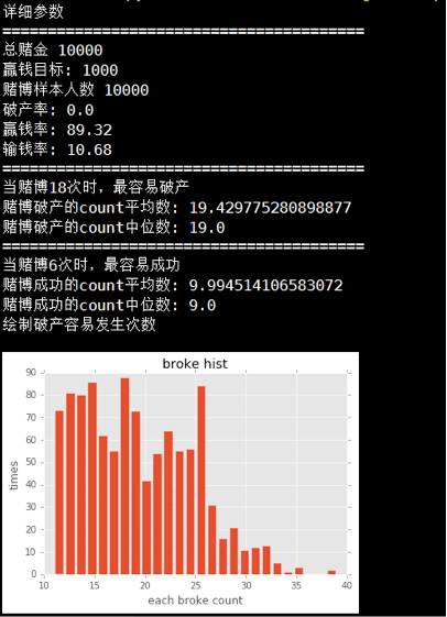 随着赌博次数增加到一万次,赌博人数达到一千人,可以看到大数法则体现,绝大多数人都破产。
