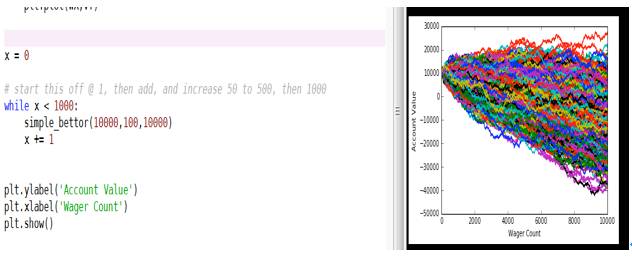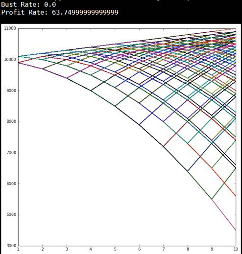 起始赌金10000元,这里有一百条曲线,代表一百个赌徒,赌博次数为100次时,大概有50条曲线在10000元以上,50条曲线在10000元以下。这表示赢钱和输钱的人差不多。
