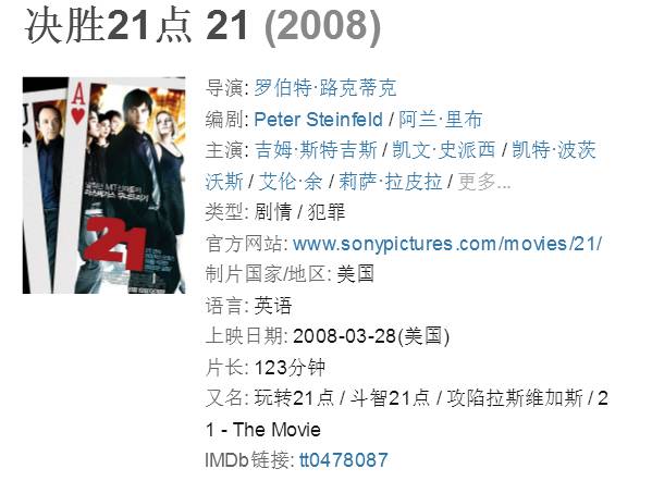 《决胜21点》讲述了几位数学天才少年凭才智大闹赌城拉斯维加斯的故事。举世闻名的麻省理工,堪称是莘莘学子、科学天才们向往的圣地。作为有幸能到这里读书的新生,本·坎贝尔(吉姆·斯特吉斯饰)自然也有他的过人之处。的确,坎贝尔超常的数学运算才能在他进入麻省理工没多久就开始崭露头角。学院里讲授数学理论课程的米基·罗萨(凯文·史派西饰)更是一眼就看中了小伙子,并对其光明的未来充满了信心。经过短暂的接触之后,罗萨教授将这位数学天才介绍给他精心培养的另外几位数学高才生认识,并邀其加入一个由罗萨领导,由吉尔(凯特·波茨沃斯饰)、费舍(雅各布·皮特斯饰)等数学天才共同组成的“特殊团队”,专攻赌场上风行的“21点”游戏。运用他们对于数学的尖端认识和运算,在经验丰富的罗萨教授的指导下,轻松应对“21点”游戏中可能出现的各种局面,最终确保高频率地取胜纪录。