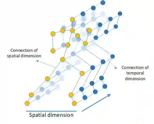 spatial-temporal graph 中有两个维度,一个是时间(temporal)维度,一个是空间(spatial)维度。空间维度为一帧内的骨架图,时间维度的构造是将相邻帧中的图同一位置的结点连接起来,从而根据骨架序列构造出了一个spatial-temporal graph。