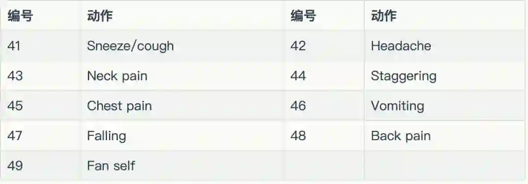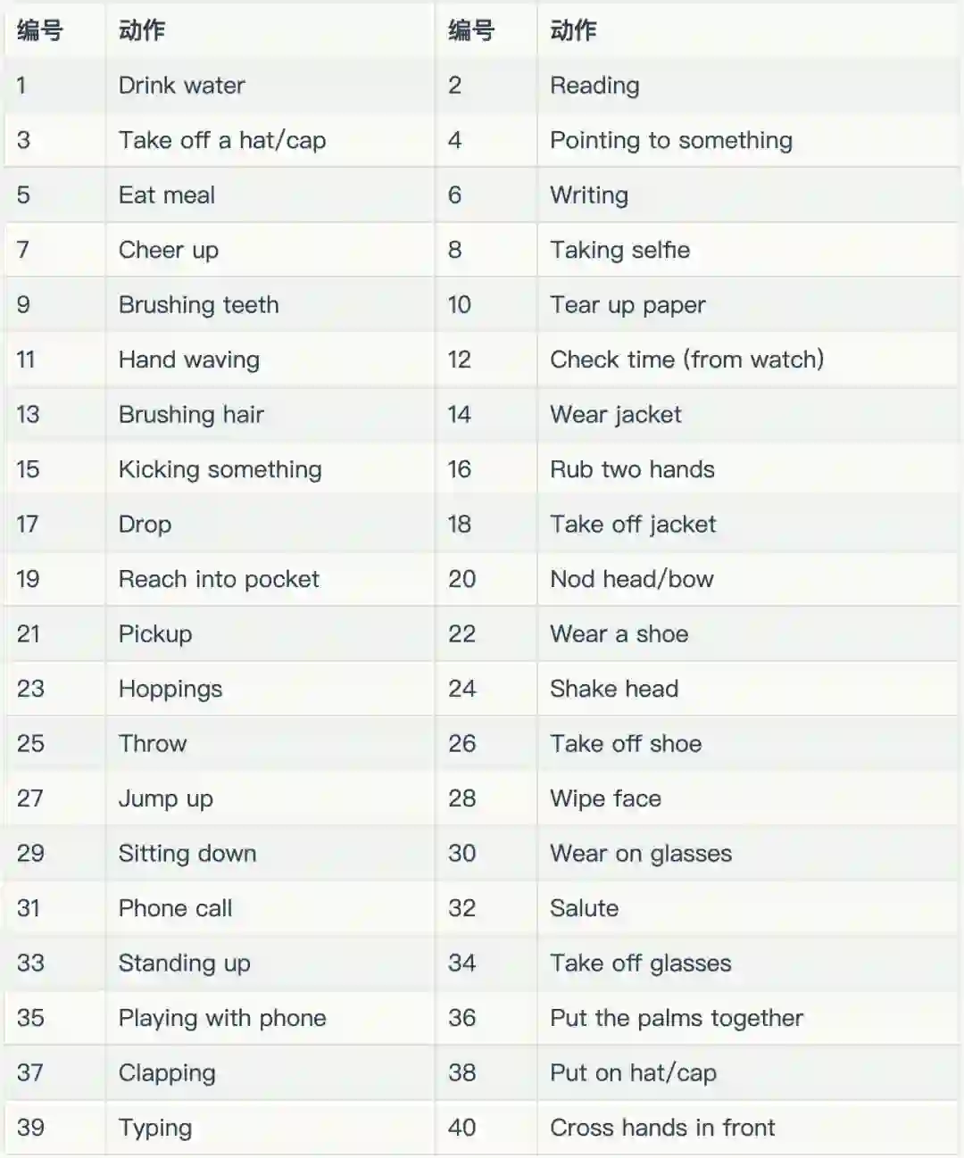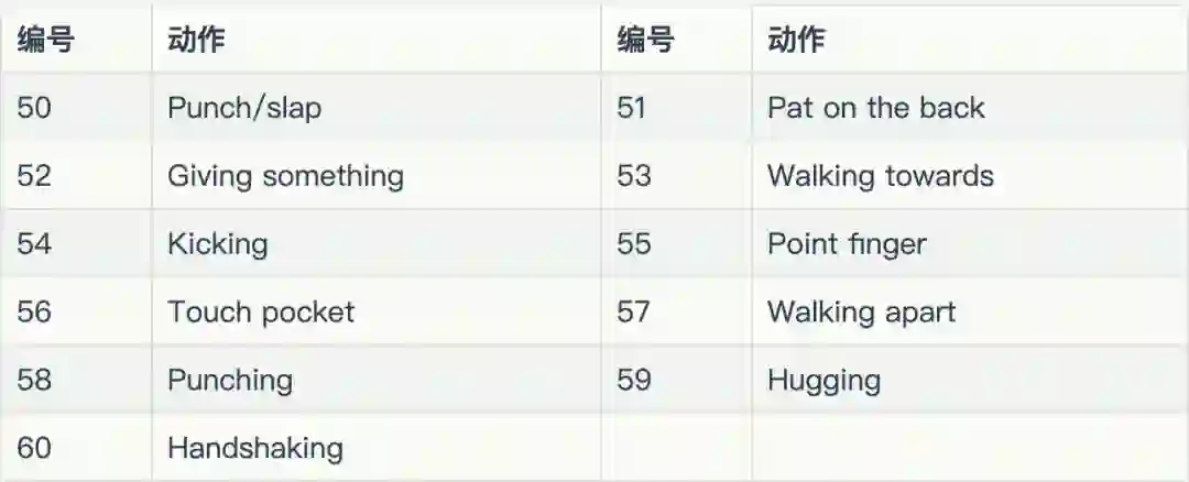 目前,在该领域内比较常用的数据集是NTU RGB+D(http://rose1.ntu.edu.sg/datasets/actionrecognition.asp) 数据集。数据集用3个 Microsoft Kinect v2 传感器采集,含有 56880 动作序列的样本,一共包含 60 类动作,主要分为三个大类: