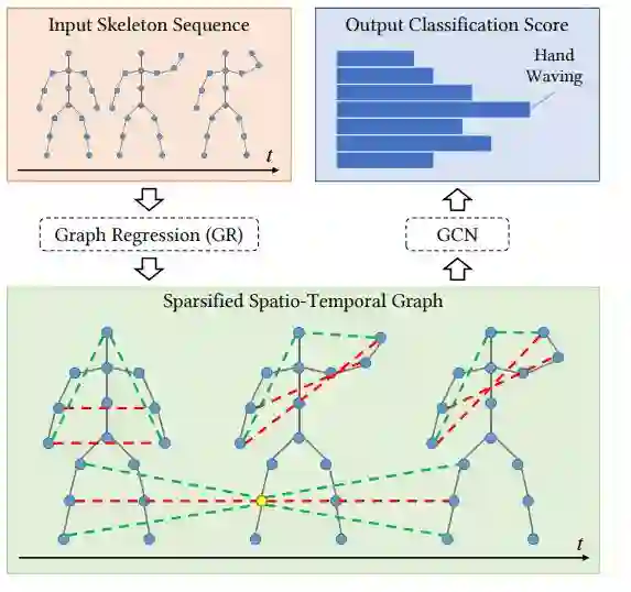 其中Sparsified Spatio-Temporal Graph为通过graph regression 的过程所学习到的图中结点的联系,其中黑色的边代表具有生理意义上的强联系,红色的边代表非生理连接但是对于动作判断很重要的语言联系,绿色的边代表比较弱的联系。得到了Sparsified Spatio-Temporal Graph再进一步通过GCN对东西进行分类。作者在实验中证明了通过graph regression的过程能够很好地提高识别的准确率。