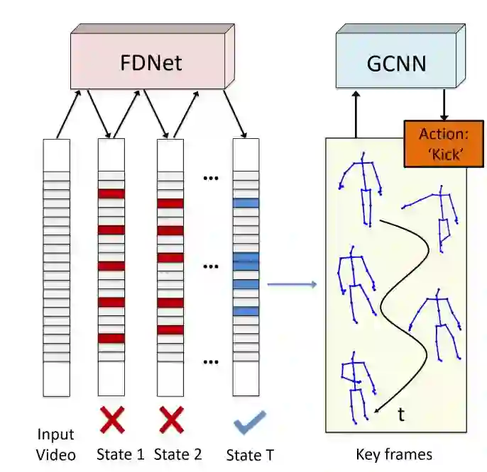 这是 CVPR 2018 中的一篇论文,作者提出了一种取关键帧的方法,类似于视频压缩中的取关键帧。因为在骨架序列中前后帧的信息可能会比较冗余,所以只需要选取序列中比较有代表性的关键帧,就可以进行动作的分类识别。所以在 GCNN 之前,作者加入了一个 FDNe t用来提取关键帧。作者实验证明,运用了取关键帧的方法,能够增加识别的准确率。