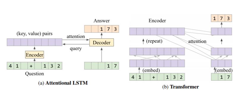 LSTM和Transformer架构都包含一个编码器和解码器。不过在具体运算逻辑上,LSTM会将问题编码为一系列由键和数值代表的具体位置(41+132),然后解码器将下一个字符预测并映射出来(173)。