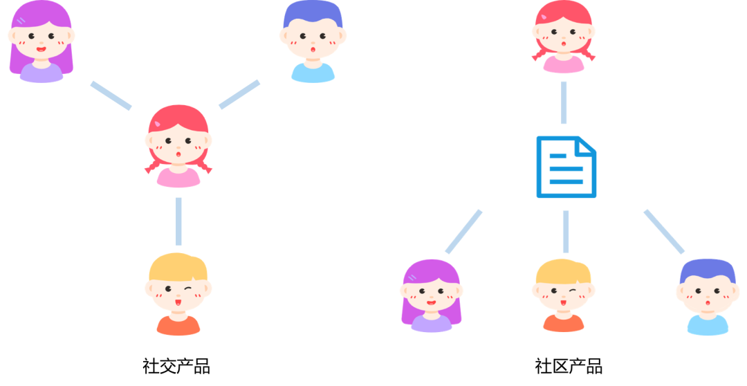 换句话说,在社交产品里人是关系链的节点,像是“用户A——用户B——用户C”,而社区产品里内容才是关系链的节点,像是“用户A——内容——用户B”。