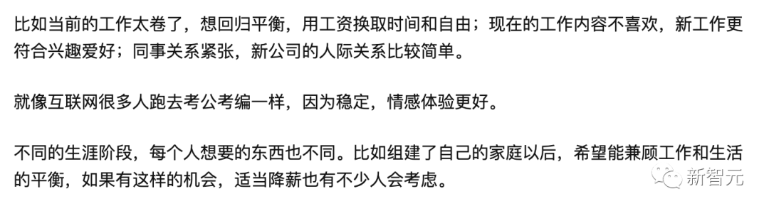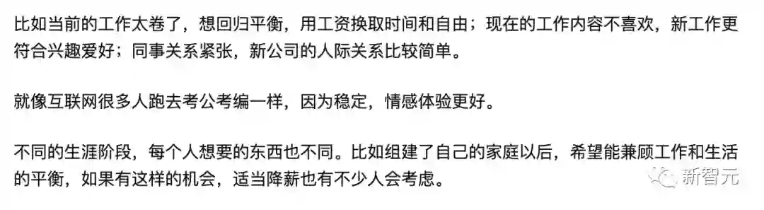 有的网友表示,很多时候,除了薪资之外,职场人还有很多其他需要考虑的因素,且随着年岁渐长,自己所关注的东西也会发生变化,如目前工作压力太大想要work life balance,亦或是对当前工作不感兴趣,也有可能是由于工作的稳定性得不到保障,想要尝试体质内的生活。