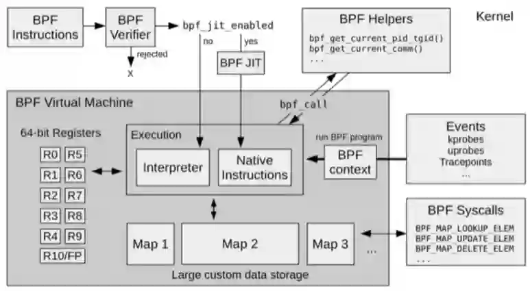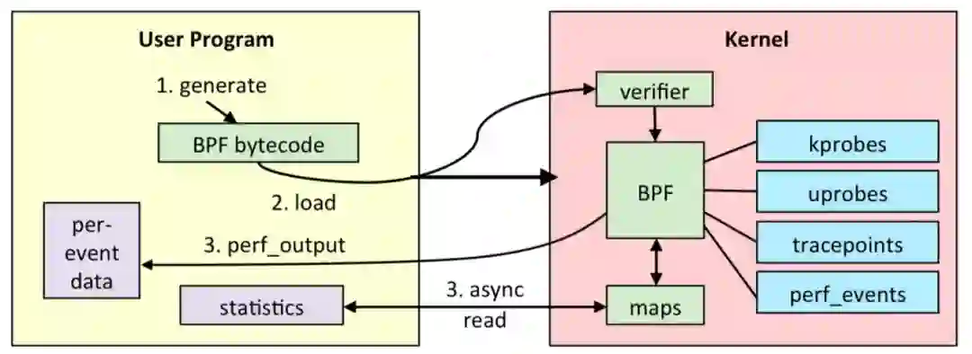 内核验证BPF字节码安全,并且确保对应事件发生时调用正确的eBPF程序,如果有状态需要保存,则写入对应BPF映射中,比如监控数据就可以写到BPF映射中。