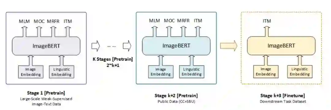 更为具体的,在ImageBERT模型中使用两阶段的预训练策略。第一个阶段使用LAIT数据集,第二个阶段使用其他公共数据集。注意,两个阶段应使用相同的训练策略。