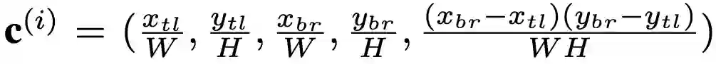 其中,(xtl,ytl)以及(xbr,ybr)分别代表边界框的左上角和右下角坐标。5维向量中的第五个分向量相对于整个图像的比例面积。