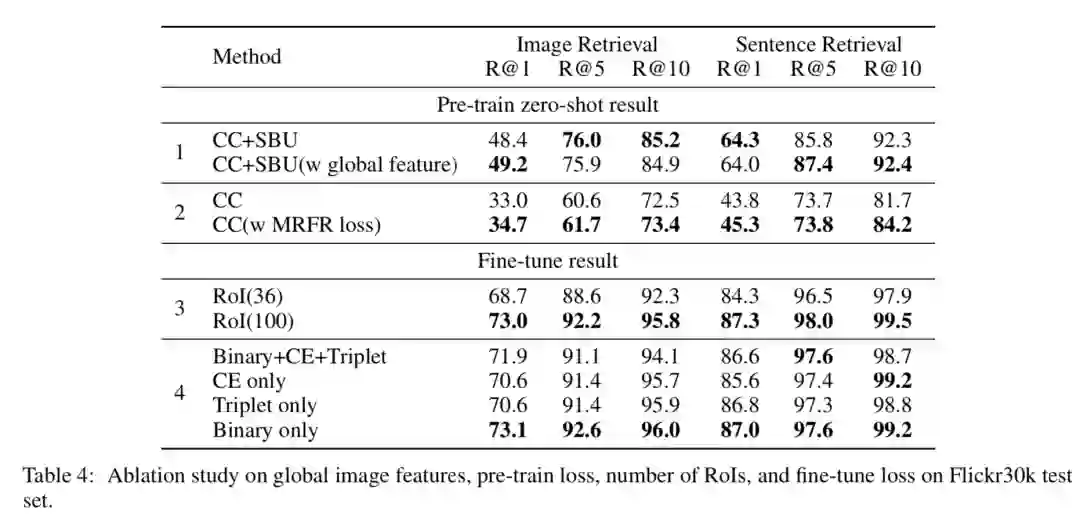 针对在第4部分所提到的三项损失,作者尝试在微调期间进行不同的组合。如表4的第4 部分所示,模型通过使用二元交叉熵损失(Binary Cross-Entropy Loss),本身就能在图像-文本检索任务上获得最佳的微调结果。