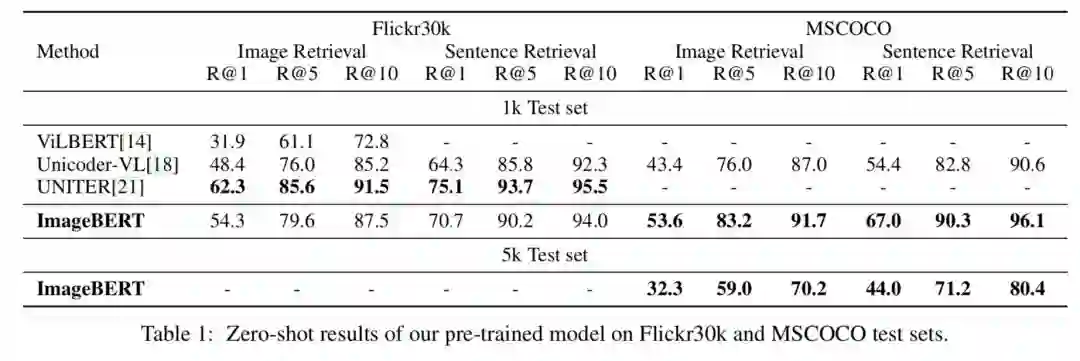 零样本结果如表 1 所示,我们可以发现,ImageBERT预训练模型在MSCOCO 获得了新的最佳结果,但在Flickr30k数据集上却比 UNITER模型的表现稍差。