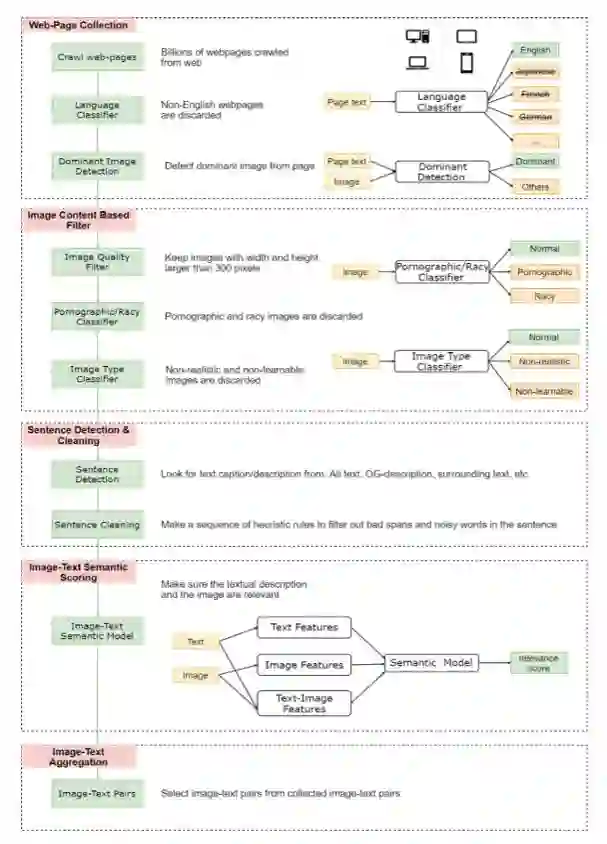 先是从网络上收集数亿的网页,从中清除掉所有非英语的部分,然后从中收集图片的URLs,并利用HTML 标记和DOM树特征检测出主要图片(丢弃非主要图片,因为它们可能与网页无关)。