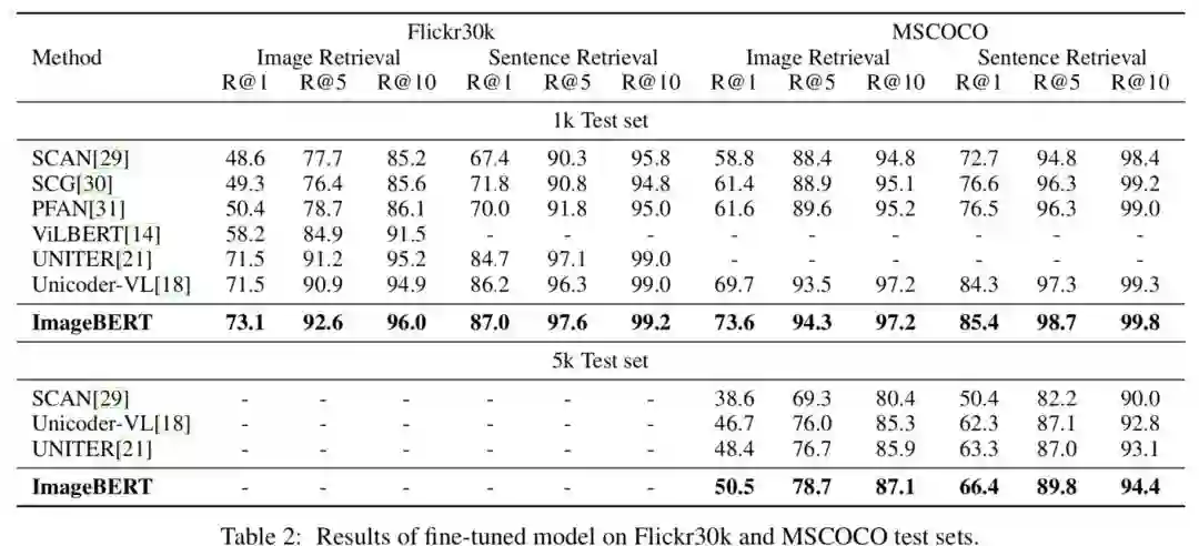 在检索任务上微调后的最终结果如表2 所示。我们可以看到,ImageBERT模型在Flickr30k 和 MSCOCO(同时在 1k和 5k的测试集)上都实现了最佳表现,并且超越了所有的其他方法,从而证明了本文所提的面向跨模态联合学习的 LAIT 数据和多阶段预训练策略的有效性。