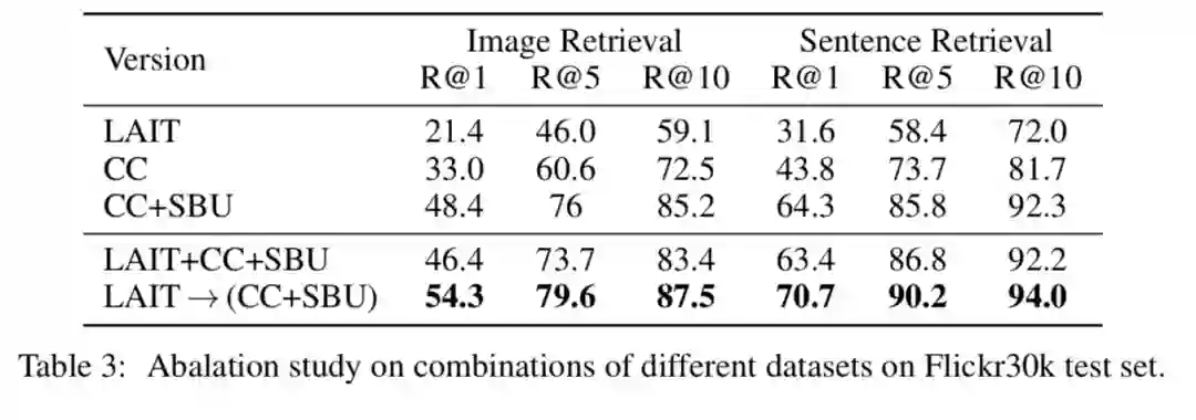 作者使用不同数据集的组合来进行预训练实验。结果如表3所示。CC表示的仅在 Conceptual Captions 数据集上进行预训练;SBU 表示仅在 SBU Captions数据集上进行预训练;LAIT+CC+SBU表示使用LAIT, Conceptual Caption 和 SBU Captions的组合数据集进行预训练;LAIT → CC+SBU 表示使用 LAIT 来完成第一阶段的预训练,之后使用 Conceptual Captions和SBU Captions 数据集来做第二阶段的预训练。