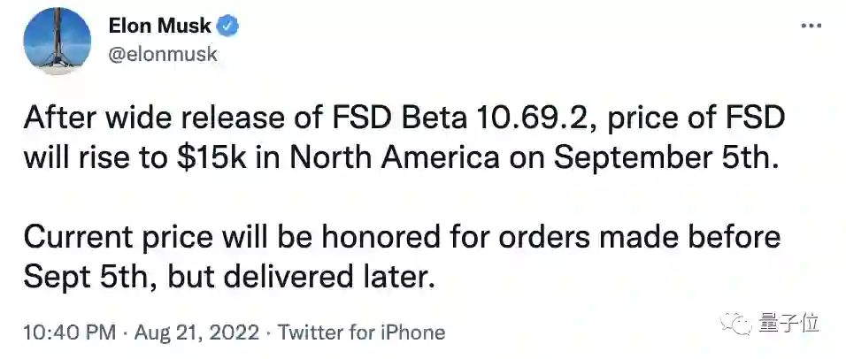 特斯拉首席执行官埃隆·马斯克(Elon Musk)在其推特上宣布,从9月5日开始,该公司的全自动驾驶系统(FSD)在北美的售价将上调25%,从1.2万美元提高到1.5万美元。