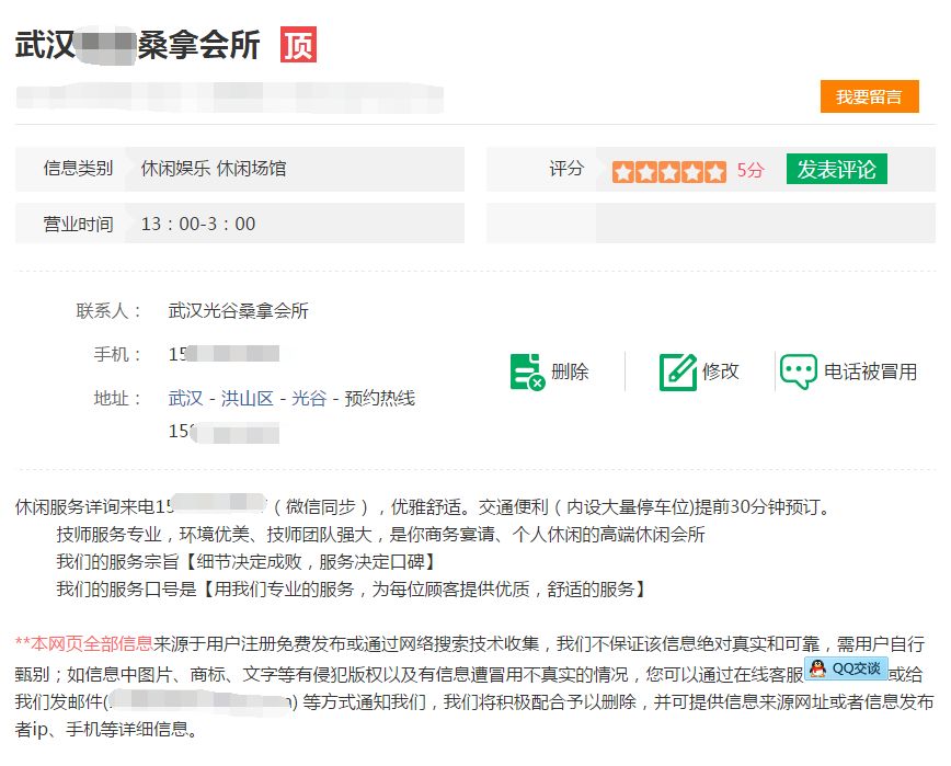 在检索该手机号遗留在互联网痕迹时,找到一个武汉同城平台发布信息——武汉红天堂桑拿会所。