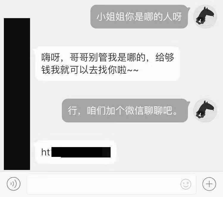 为了确认判断,我在微信上给老鸨打了一个微信电话,借故再次询问交易方式,而话筒传来的声音是20出头的小伙子。