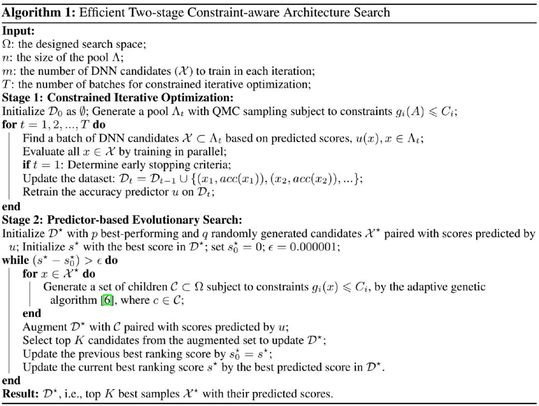如果搜索空间过大则会导致搜索评估变得不可能,为缓解复杂度问题,作者设计了一种两阶段的搜索算法:(1)粗粒度搜索;(2)细粒度搜索。见下图中的算法1.
