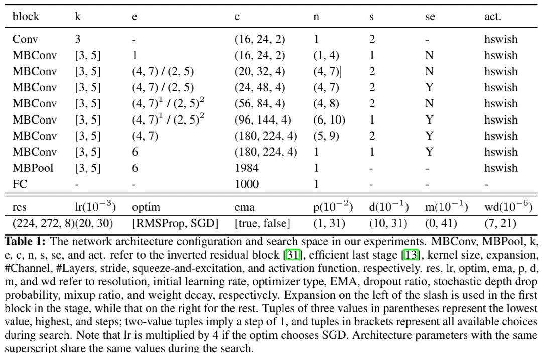 其中, 分别表示网络架构、训练策略以及搜索空间(见下表); 表示资源约束信息,比如计算量、存储以及推理耗时灯。