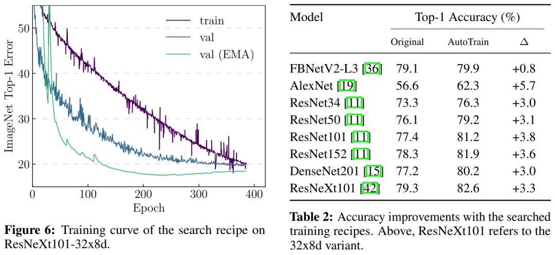 在自动训练实验中,作者仅在固定架构上调整了训练策略;而在联合搜索时,作者对训练策略以及网络架构同时进行搜索,整个搜索空间大小为 个网络架构与 个训练策略。