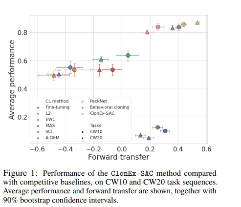 持续学习系统从以前看到的任务中迁移知识,以最大限度地提高新任务的性能的能力,是该领域的一个重大挑战,限制了持续学习解决方案对现实场景的适用性。因此,本研究旨在拓展我们对持续强化学习中迁移及其驱动力的理解。我们采用SAC作为底层RL算法,连续世界作为一组连续控制任务。我们系统地研究了SAC的不同组成部分(参与者和批评者、探索和数据)如何影响传输效果,并提供了关于各种建模选项的建议。最好的一组选择被称为ClonEx-SAC,是根据最近的Continual World基准进行评估的。ClonEx-SAC的最终成功率为87%,而PackNet的成功率为80%,是基准测试中最好的方法。此外,根据Continual World提供的度量,转移从0.18增长到0.54。