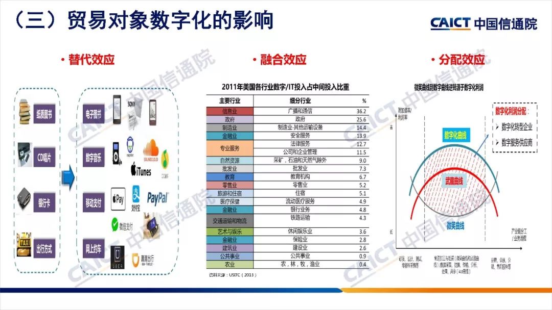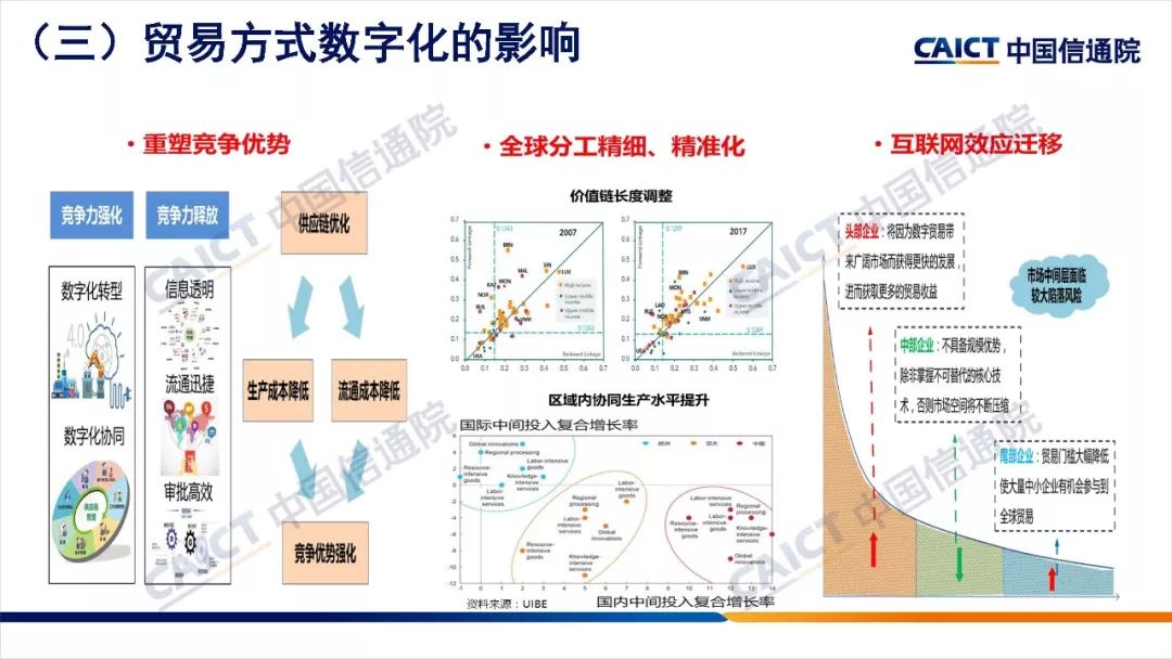 三是新影响。从总量上来看,信息通信技术使得贸易规模扩张、分工优化,消费者福利得到进一步改善。从结构来看,国际贸易的分工、分配模式都会因为贸易方式和贸易对象的变化出现新的变化。