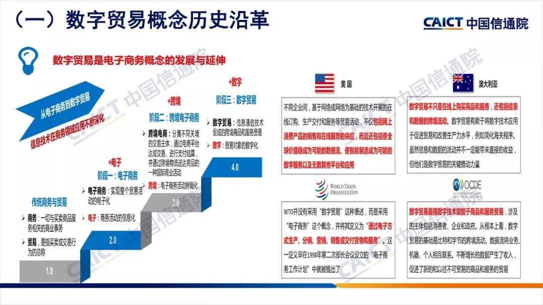 目前,国际上对数字贸易尚没有形成统一认识,美国、澳大利亚、OECD都提出了各自看法,WTO对数字贸易的讨论仍是在电子商务议题下开展的。