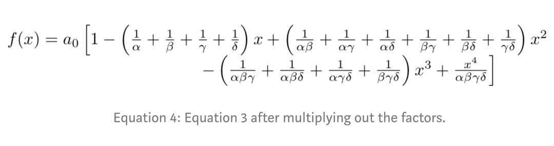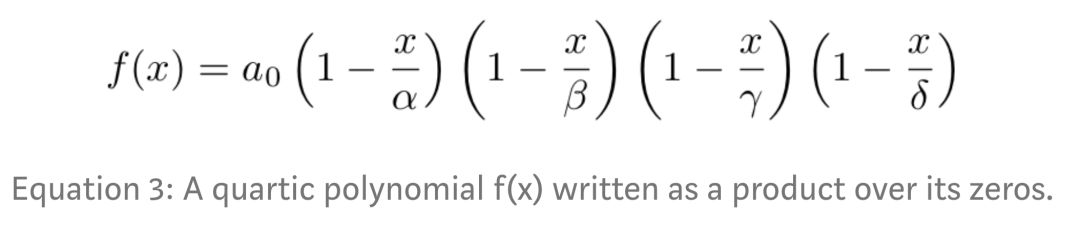 为了理解这一点,考虑如下四次多项式的零点,很明显当 x 分别等于 𝛂 和 𝛃等常量的时候存在零点。