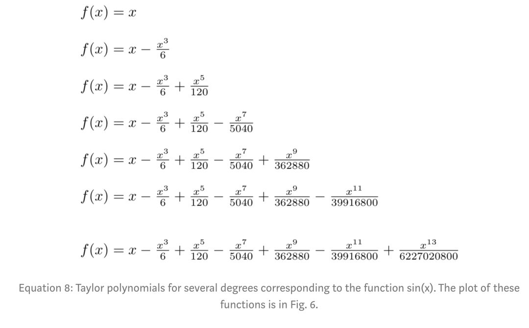 我们还记得,需要找的是逼近 sinc(πx) 立方项的系数,图 6 中的 7 个泰勒展开式具有如下形式:
